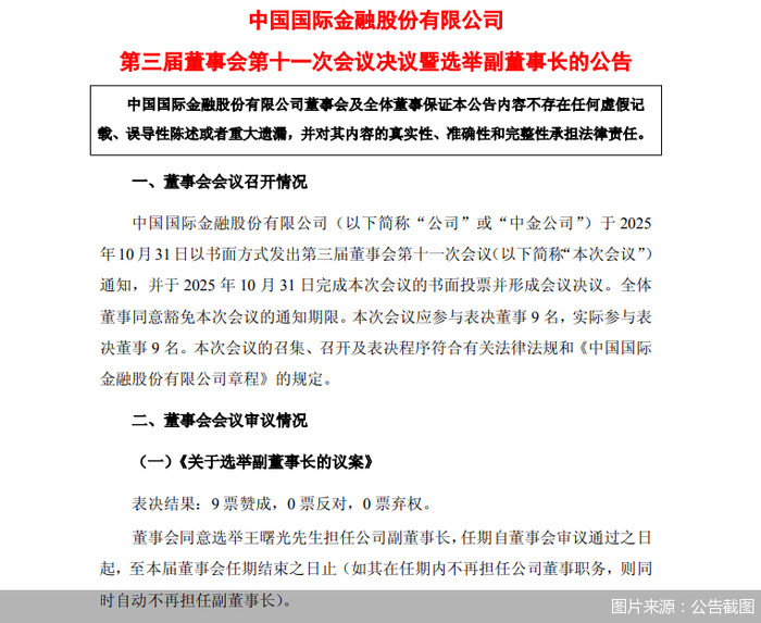 北京商报讯(记者李海媛)10月31日,中金公司公告称,公司第三届董事会第十一会议审议通过了《关于选举副董事长的议案》,同意选举王曙光担任公司副董事长,任期自董事会审议通过之日起,至本届董事会任期结束之日止(如其在任期内不再担任公司董事职务,则同时自动不再担任副董事长)。此前在8月29日,中金公司第三届董事会第八次会议审议通过,王曙光获委任为公司总裁。